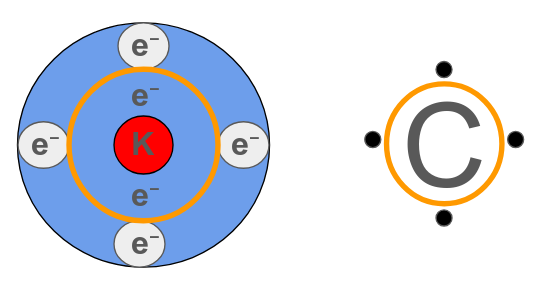 Der orange Kreis umfasst in der oberen Zeichnung den Atomrumpf. Modellhaft dargestellt ist ein Kohlenstoffatom. Mit dem Begriff des Atomrumpfes wird eine Kurzschreibweise für das Kugelwolkenmodell möglich.
