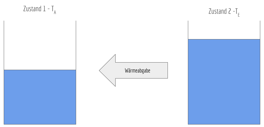 Im Zustand 2 besitzt das System eine höhere Temperatur als im Zustand 1. Diese Energie wird frei und an die Umgebung abgegeben, wenn man das System abkühlen lässt. Also muss dass System im Zustand 2 mehr Energie besitzen als im Zustand 1. Es kann weitere Wärme an die Umgebung abgegeben werden, wenn man das System in eine kältere Umgebung bringt, da Wärme immer zum System mit der geringeren Temperatur hin übertragen wird. Neben der Temperatur verändern sich bei der Abkühlung u.U. weitere Zustandsgrößen wie etwa das Volumen.