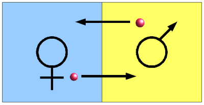Die Mädchen „werfen“ die Edukte (Tennisbälle) ins Feld der Jungen, in dem sie zu den Produkten werden. Aus Sicht der Jungen sind die Produkte die Edukte, die zurück ins Feld der Mädchen geworfen werden, in dem sie wieder zu den Ausgangstoffen reagieren. Die Anzahl der Edukte/Produkte je Feld ändert sich im zeitlichen Mittel nicht, sondern strebt einem konstanten Wert zu. Die Bewegung der Spieler:innen ist eine Analogie zur Temperatur, die letztlich ja auch als ein Maß für Teilchenbewegung betrachtet werden kann.