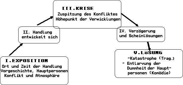 „Durch die beiden Hälften der Handlung, welche in einem Punkt zusammenschließen, erhält das Drama, - wenn man die Anordnung durch Linien verbildlicht, - einen pyramidalen Bau. Es steigt von der Einleitung mit dem Zutritt des erregenden Moments bis zu dem Höhepunkt, und fällt von da bis zur Katastrophe. Zwischen diesen drei Teilen liegen die Teile der Steigung und des Falles. Jeder dieser fünf Teile kann aus einer Szene oder aus einer gegliederten Folge von Szenen bestehen, nur der Höhepunkt ist gewöhnlich in einer Hauptszene zusammengefaßt. Diese Teile des Dramas, a) Einleitung, b) Steigerung, c) Höhepunkt, d) Fall oder Umkehr, e) Katastrophe, haben jeder Besonderes in Zweck und Baurichtung. Zwischen ihnen stehen drei wichtige szenische Wirkungen, durch welche die fünf Teile sowohl geschieden als verbunden werden. Von diesen drei dramatischen Momenten steht eines, welches den Beginn der bewegten Handlung bezeichnet, zwischen Einleitung und Steigerung, das zweite, Beginn der Gegenwirkung, zwischen Höhepunkt und Umkehr, das dritte, welches vor Eintritt der Katastrophe noch einmal zu steigern hat, zwischen Umkehr und Katastrophe. Sie heißen hier: das erregende Moment, das tragische Moment, das Moment der letzten Spannung. Die erste Wirkung ist jedem Drama nötig, die zweite und dritte sind gute, aber nicht unentbehrliche Hilfsmittel .“ (S.102)