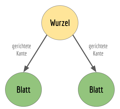 Ein Baum besteht aus Knoten. Ganz oben befindet sich der Wurzelknoten. Mit ihm sind im Falle eines Binärbaumes zwei Blattknoten verbunden. Die Verbindung zwischen den Knoten bezeichnet man als Kante. Die Information, welche Blattknoten mit dem Wurzelknoten verbunden sind, befindet sich nur im Wurzelknoten. Der Wurzelknoten „zeigt“ damit auf die Blattknoten, weswegen man die Kante auch als gerichtet bezeichnet.