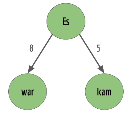 Auf diese Weise könnte in einem Sprachmodell hinterlegt sein, wie wahrscheinlich es ist, welches Wort auf den Satzanfang „Es“ folgt. Hier einmal ein Beispielimplementierung für den letzten Baum. Die Knoten werden als zusätzliche Erweiterung in einer Liste nodes[] organisiert, damit man bei der Implementierung besser durch den Baum „scannen“ (Fachwort: traversieren) kann. .